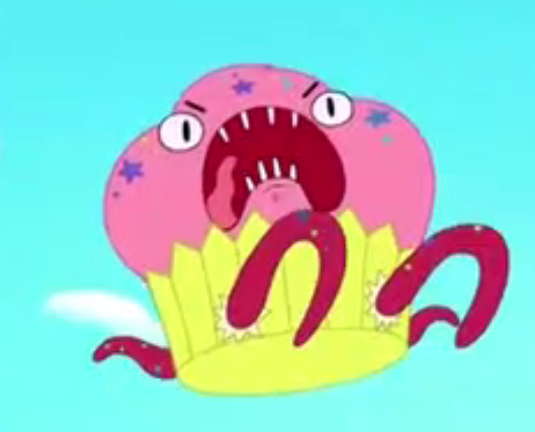 The cupcake monster is a recent creation of Dr. Fox's, in an attempt for a new cupcake recipe. Despite Puppycorn finding him delicious, he quickly turned the tables, demonstrating by eating a part of Unikitty's tail.