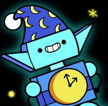 The Sandman is a light blue elf wearing dark blue pajamas with a big yellow clock on them.